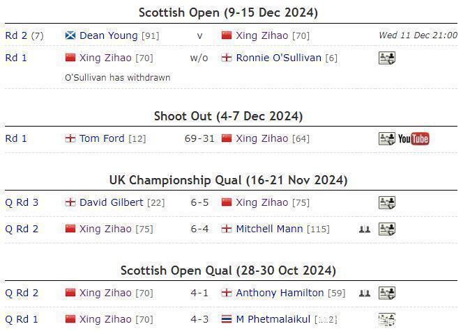 邢子豪在经验赛第一轮,以4-3险胜佩特马莱古。经验赛第二轮,邢子豪又以4-1昔时慑服安东尼-汉密尔顿,两连胜之后,强势晋级苏格兰公开赛正赛。来到正赛第一轮,又以奥沙利文的退赛,邢子豪自动晋级。第二轮,邢子豪迎战迪恩-杨,期待他的好音讯!