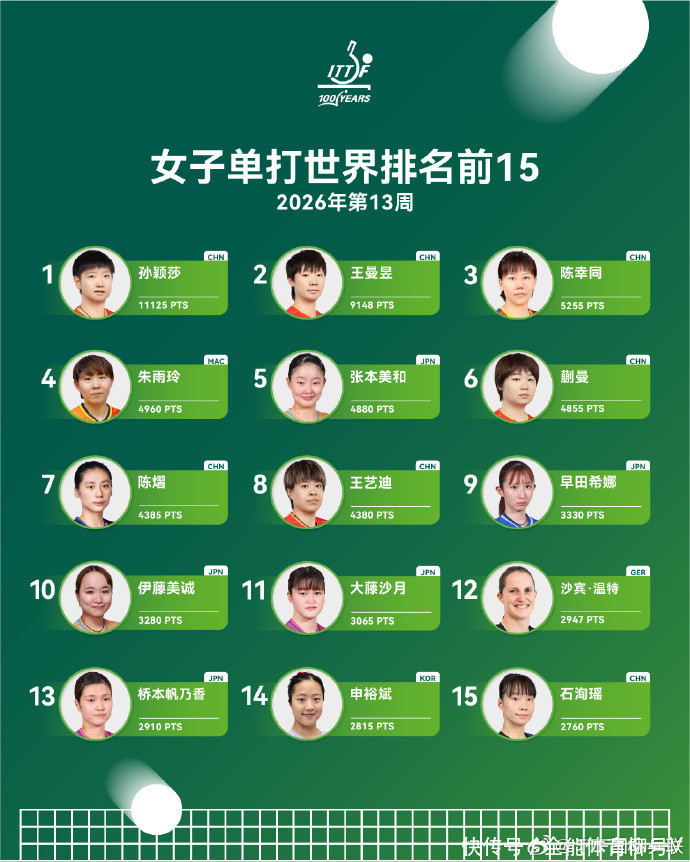 海外乒联2026年第13周女子单打寰宇排行,中国选手在前10中占据6席,孙颖莎、王曼昱、陈幸同高居前三位,蒯曼第6,陈熠第7,王艺迪第8。 女单前10中有3名日本选手,张本好意思和第5、早田希娜第9、伊藤好意思诚第10。其中,孙颖莎以1112分断层逾越。